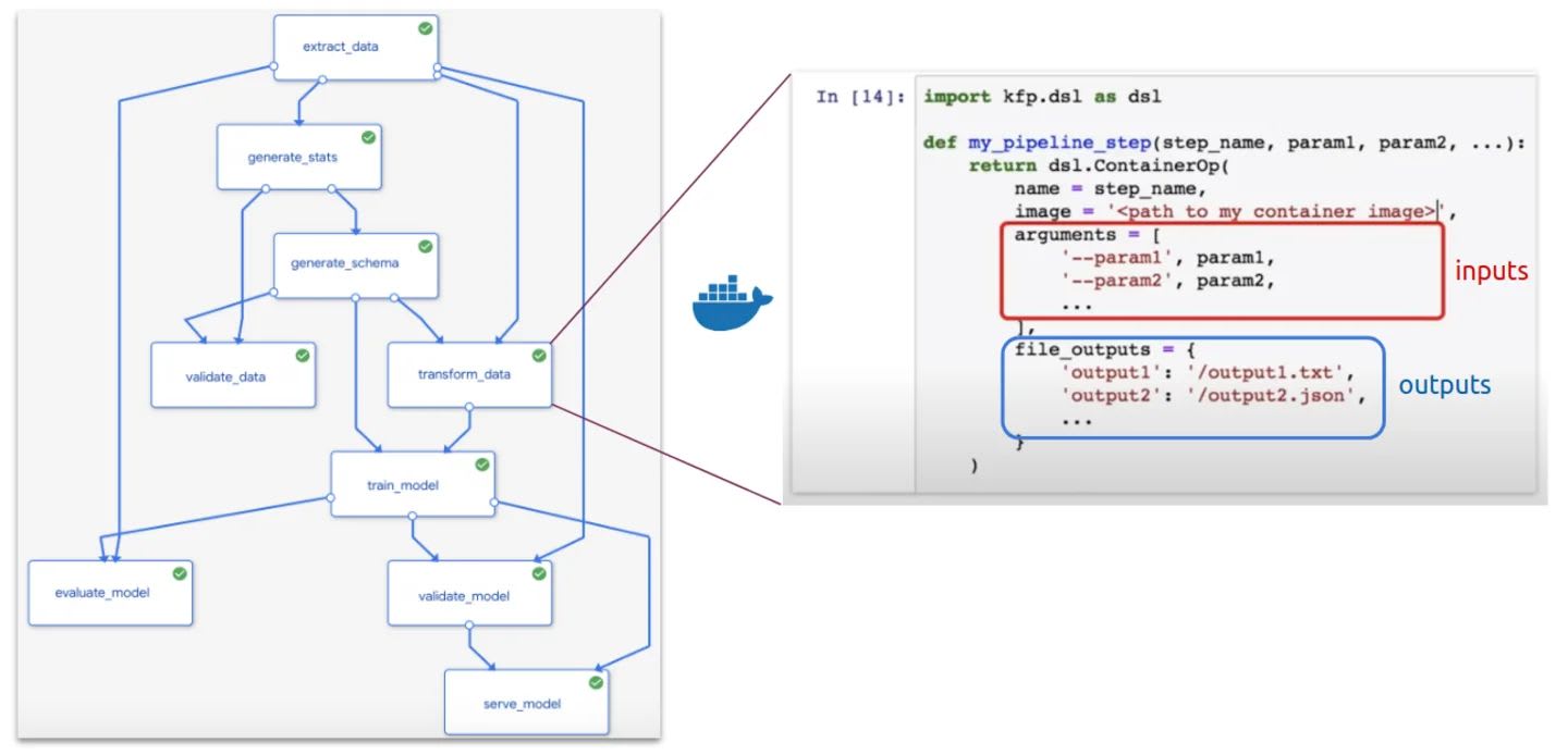 每个管道组件,呈现为一个区块,是一个独立的代码,通常打包为Docker镜像。它包含输入(参数),输出和管道中执行的一步。在上面管道示例中,transform_data步骤需要作为extract_data和generate_schema步骤的输出产生的参数,并且其输出是train_model的依赖项。