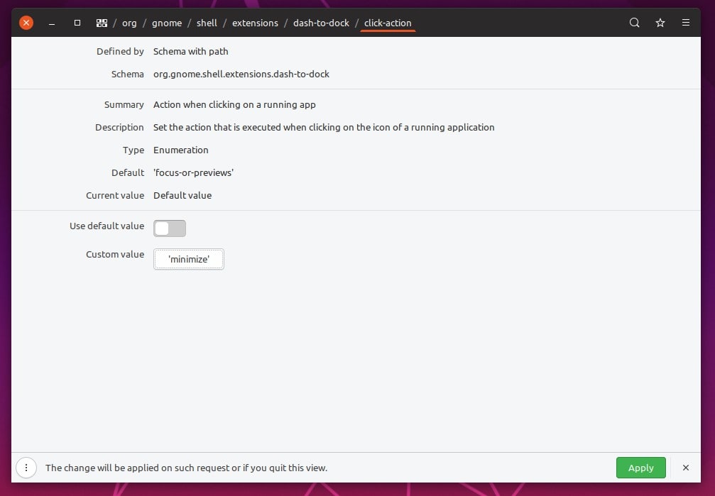 gsettings set org.gnome.shell.extensions.dash-to-dock click-action ‘minimize’