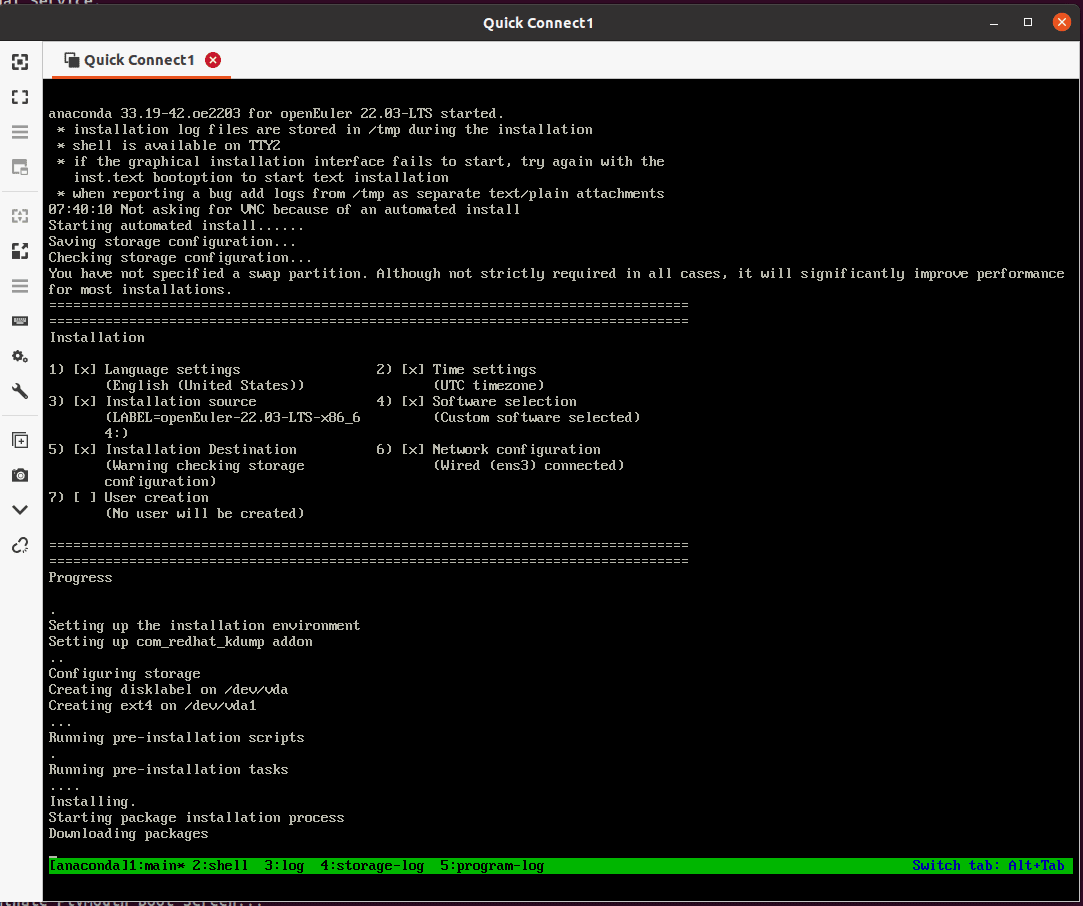 Packer 构建依赖于 kickstart配置文件并等待其所创建的虛拟机在完成安装之后自动关机,通过 vnc 来监控日志输出的错误对调试问题极其有用。如果有Ubuntu 桌面系统,可以使用 Remmina 等 VNC 客户端进行访问。 vnc 端口可以在packer构建的输出中找到。